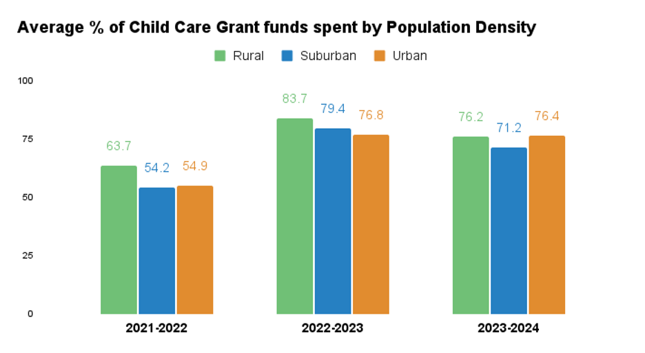Despite the drop in allocated funds in FY 2023-24, community colleges serving rural areas allocated close to or more child care grant funding in the last three years than their suburban and urban counterparts.
