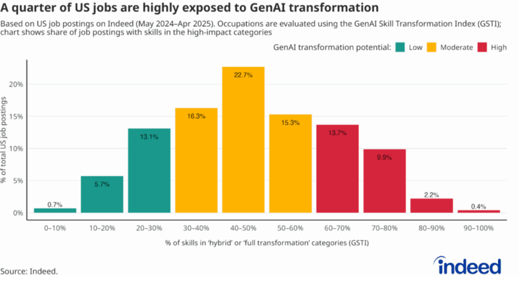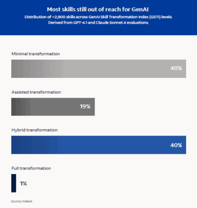 A new report from Indeed finds that a quarter of U.S. jobs could be “highly” transformed by generative artificial intelligence (GenAI), but only 1% of skills can be independently executed by GenAI.