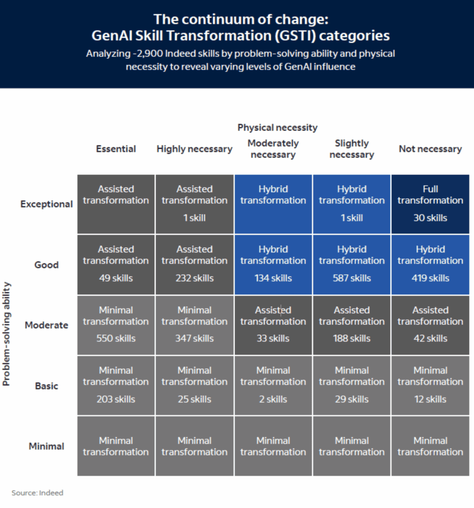 Indeed economists applied the GSTI to 2,884 common job skills extracted from 53.5 million U.S. job postings listed on Indeed between May 2024 and April 2025. Their assessment surfaced four areas of potential GenAI-driven skill transformation, and each job skill was placed within one of these four transformation zones.