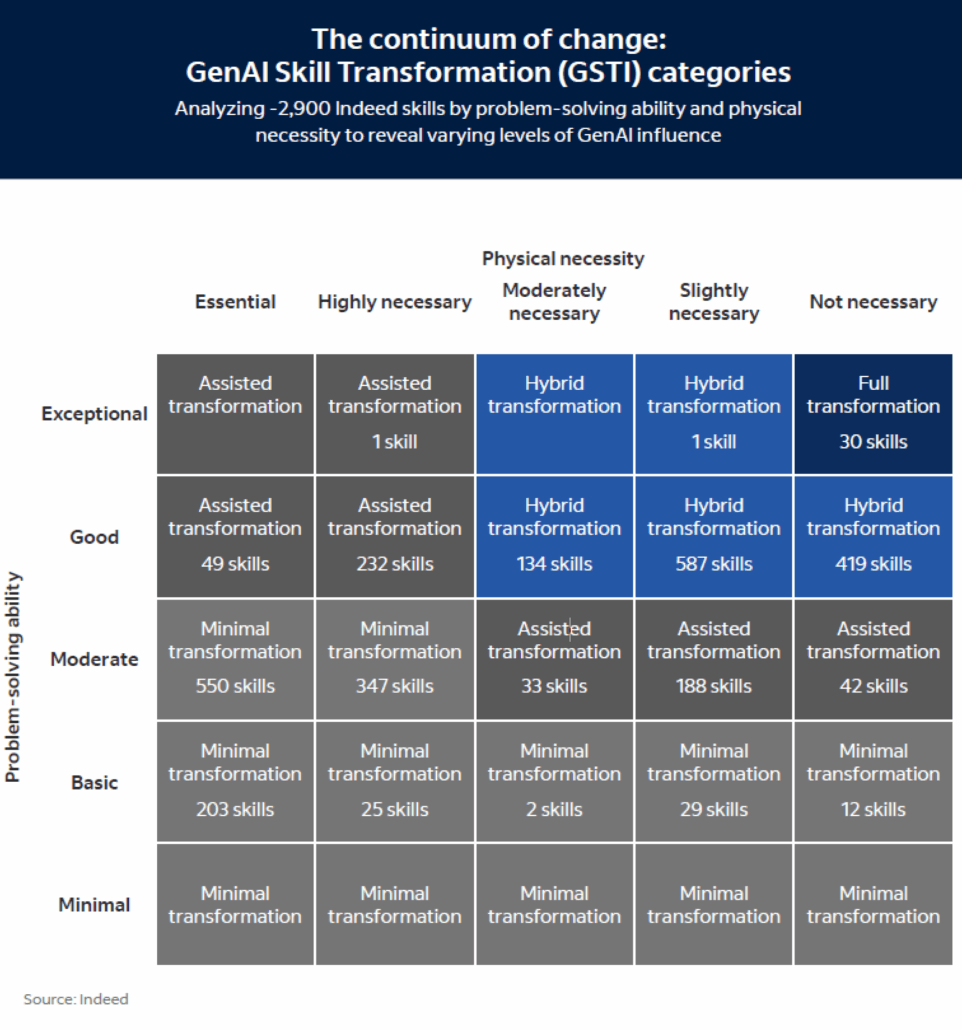 Indeed economists applied the GSTI to 2,884 common job skills extracted from 53.5 million U.S. job postings listed on Indeed between May 2024 and April 2025. Their assessment surfaced four areas of potential GenAI-driven skill transformation, and each job skill was placed within one of these four transformation zones.
