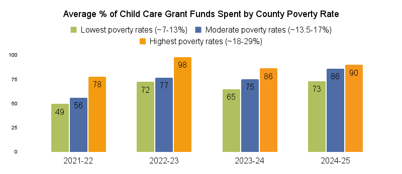 Looking at community colleges’ child care grant spending by their service counties’ poverty rate reveals that, on average, community colleges with service areas that have the highest percentage of people living in poverty generally spent a higher share of their allocated grant funds.