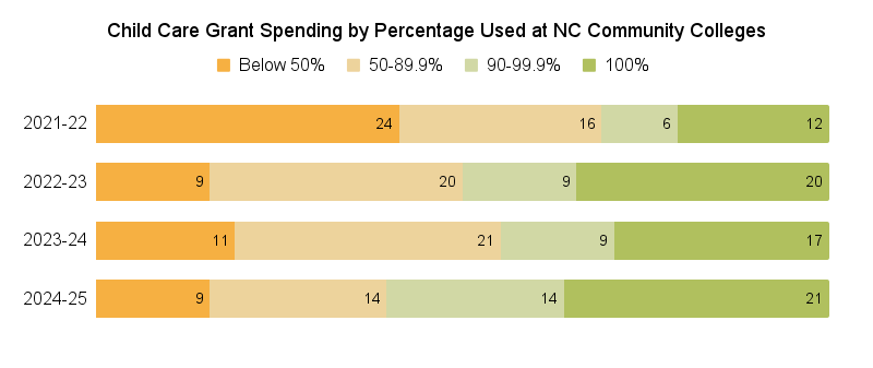 Another challenge is the grant’s reimbursement model. Last year, EdNC learned that a point of confusion that appeared to hinder grant expenditure was whether or not colleges are allowed to reimburse student parents directly for child care expenses. According to NCCCS policy, “funds must be disbursed directly to the provider or the student parent only upon receipt of an invoice from a child care provider accompanied by a student’s class attendance report,” followed by, “Neither the student parent, nor the other parent of the child may be reimbursed for services.”