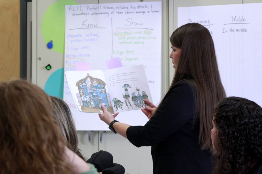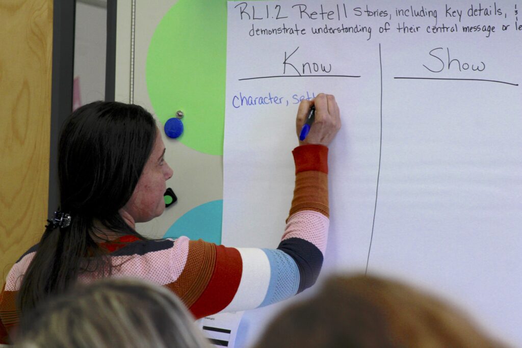 Following, Floyd picked up the children’s book and modeled how a reteaching of the book may look. The grade level discussed the models, their own ideas for reteaching, and then participate in one-on-one role play practice with members of the instructional team. From there, Floyd set forth the timeline for the reteaching, which would present the opportunity for assessing that specific standard through an observation.