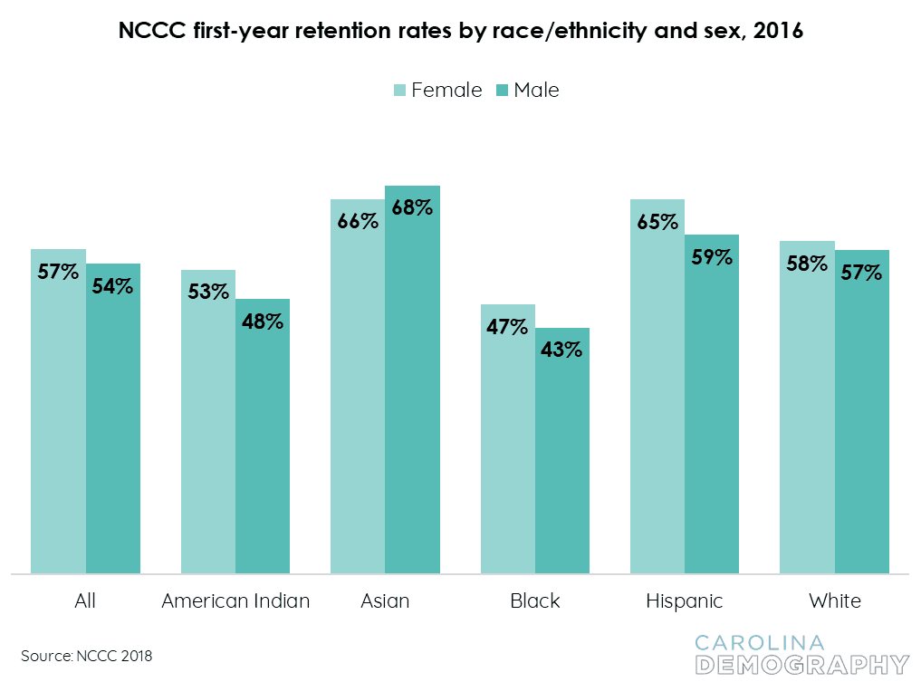 - The gap between Black female students (47%) and Black male students (43%) was four percentage points. Both female and male Black students had lower first-year retention rates at NCCC than any other subgroup.