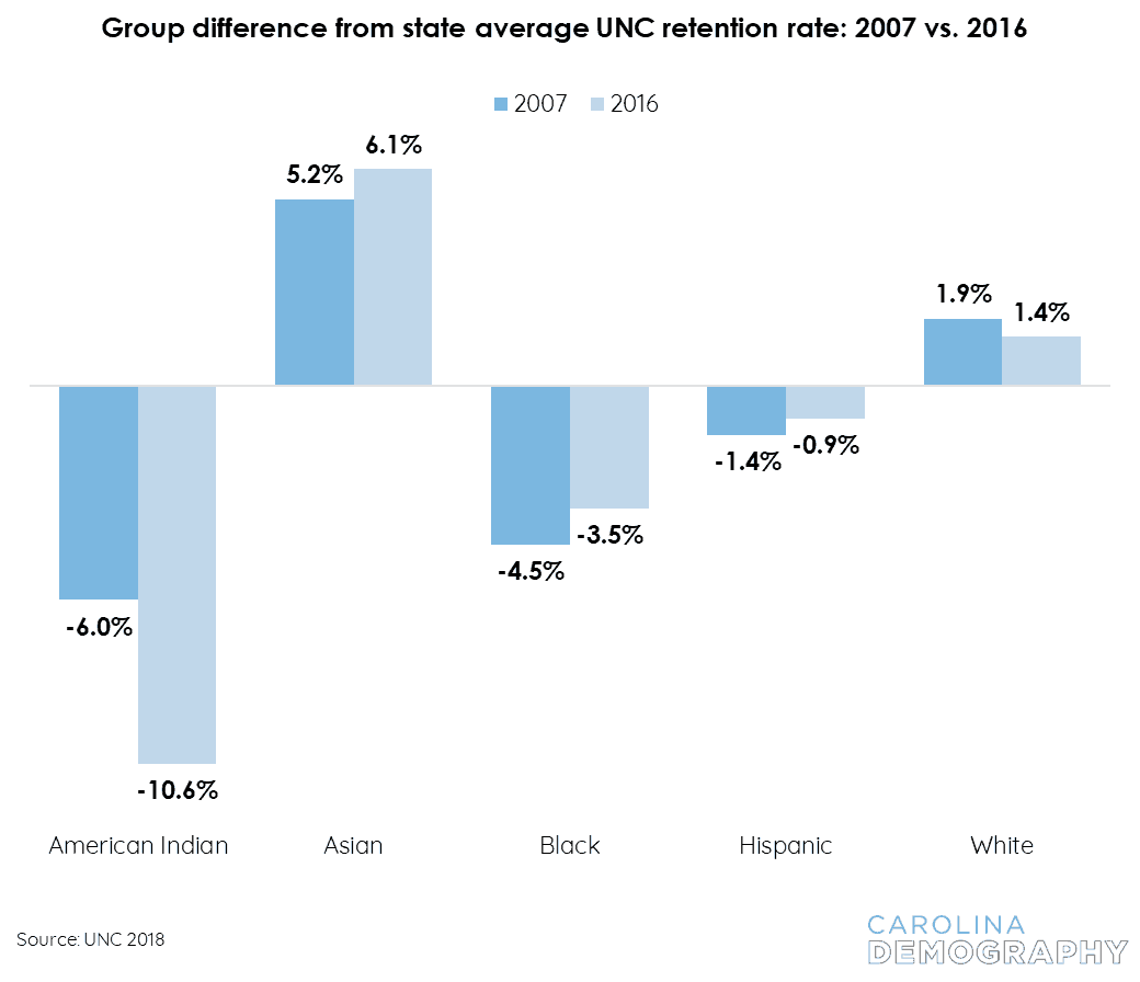 - In 2007, Black first-year retention rates at UNC lagged the state average by 4.5 percentage points. This gap narrowed to 3.5 percentage points in 2016.