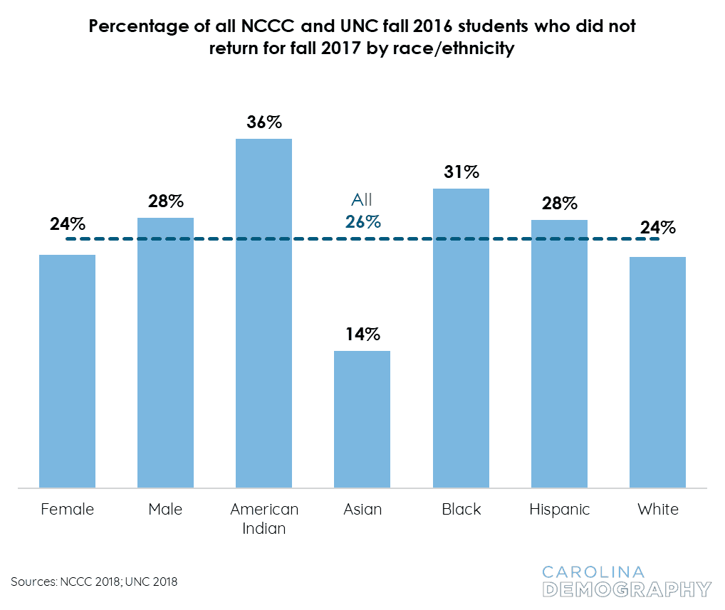 Overall, male students were more likely to leave (28%) than female students (24%), although sex differences were not as pronounced as differences in attrition by racial/ethnic subgroup. More than one in every three (36%) American Indian students who began NCCC or UNC in fall 2016 did not return for their second year, the highest rate of any group; this first-year attrition rate was twenty-two percentage points higher than Asian students (14%), who had the lowest attrition rate. Black (31%) and Hispanic (28%) students were also more likely to leave than the state average rate. For Black students, this reflects belowaverage retention rates at both NCCC and UNC. For Hispanic students, this reflects their greater likelihood of enrolling in community colleges where retention rates are generally lower.