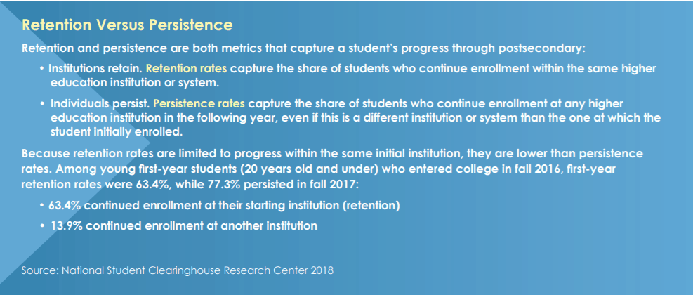 Some of the students who were not retained after their first year may have transferred to another institution and persisted in their postsecondary education, but the current data do not provide detail to understand “loss” due to transfer versus loss due to stopout or dropout.