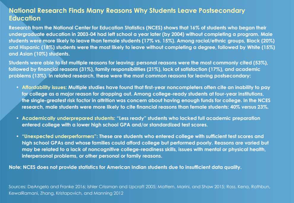 Affordability is also cited as a common reason for leaving college after the first year.9 For students with a strong academic profile (i.e., “college-ready”), the greatest risk factor in dropping out was concern about paying for college.10
