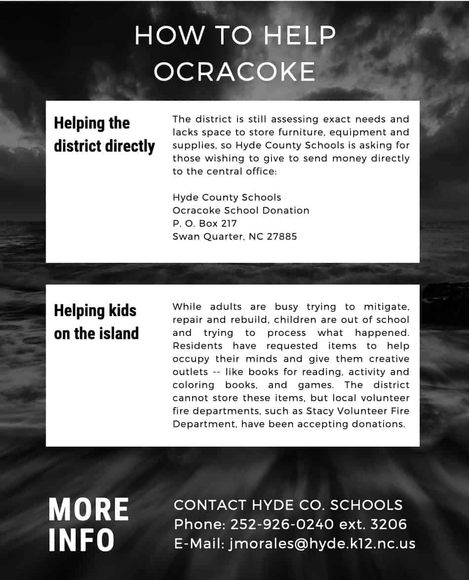 The top option thus far is holding classes on the island in borrowed space. The county and local businesses have offered help, but with nearly every structure on Ocracoke Island impacted in some way, finding a single location proved unfruitful.