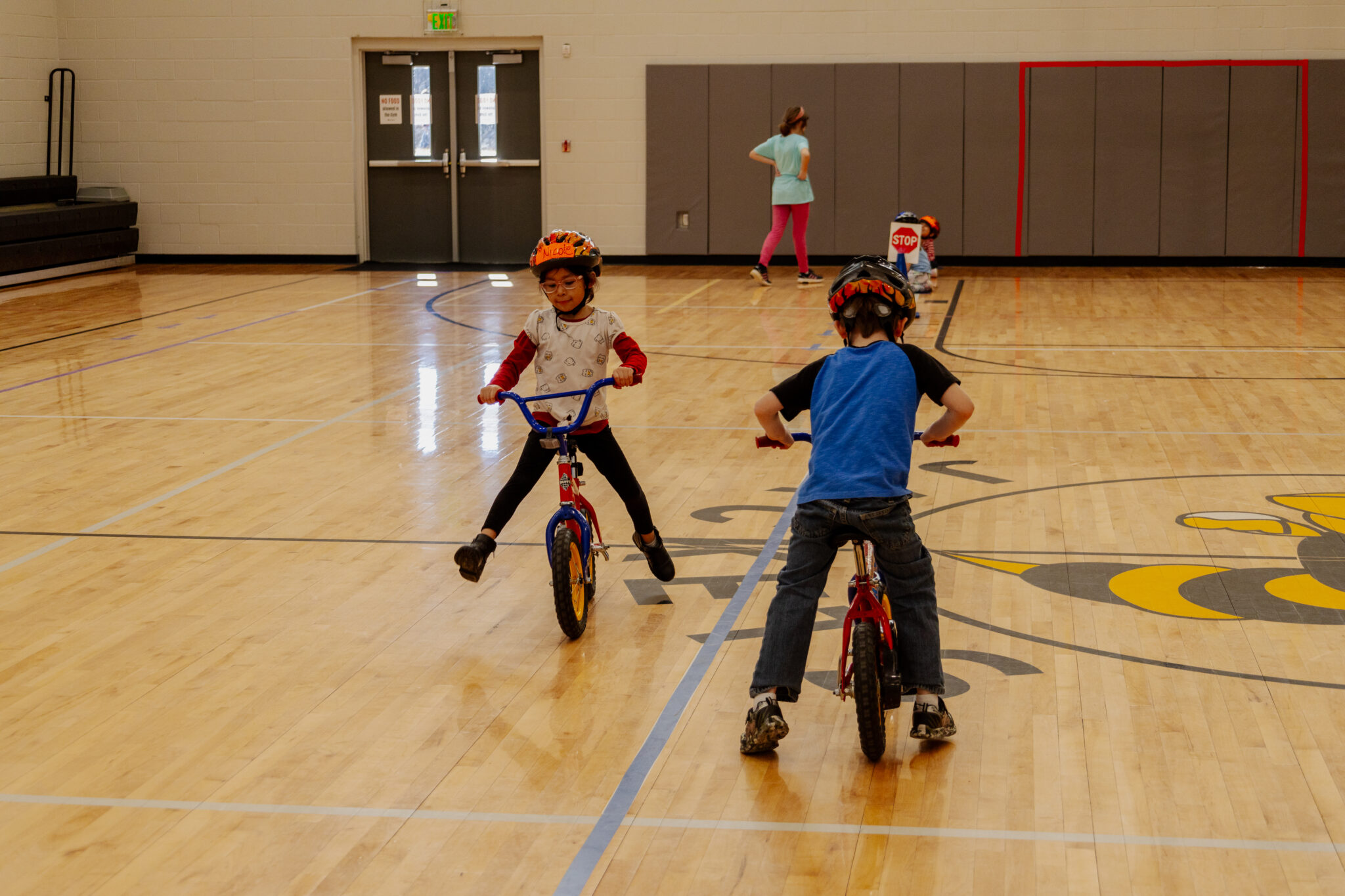 Bike helpers assist Young in setting the gym up, getting helmets and bicycles out of storage, helping kindergartners transition, and providing encouraging words and support.