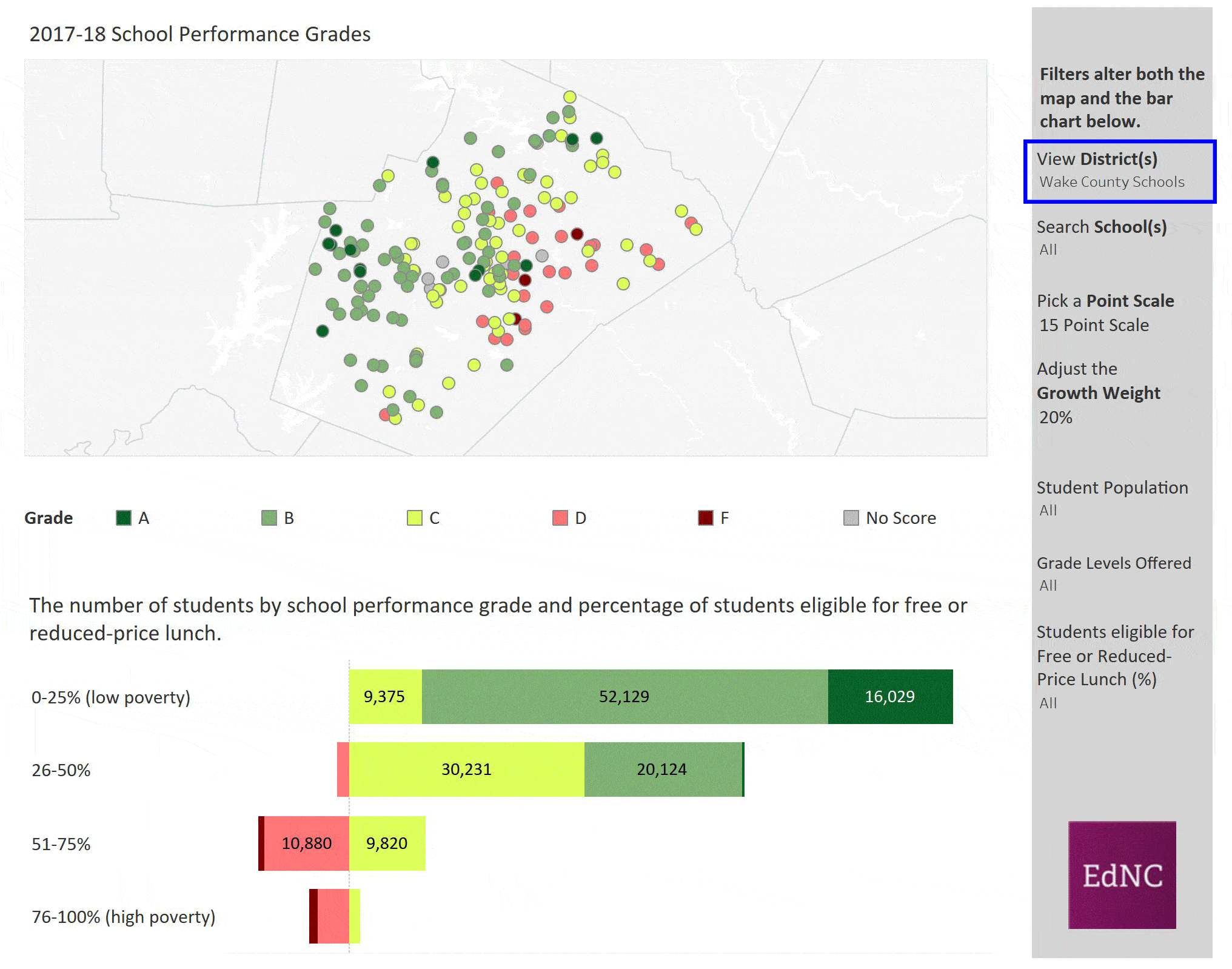 2. Now, let’s zero in on a specific county – Wake. Again the map shows the distribution of schools by letter grade across the district, and the bar chart shows the number of students in schools earning each grade crossed with FRL. Based on the current configuration of the school grades, about 88 percent of Wake County students attend schools with performance grades of A, B, or C.