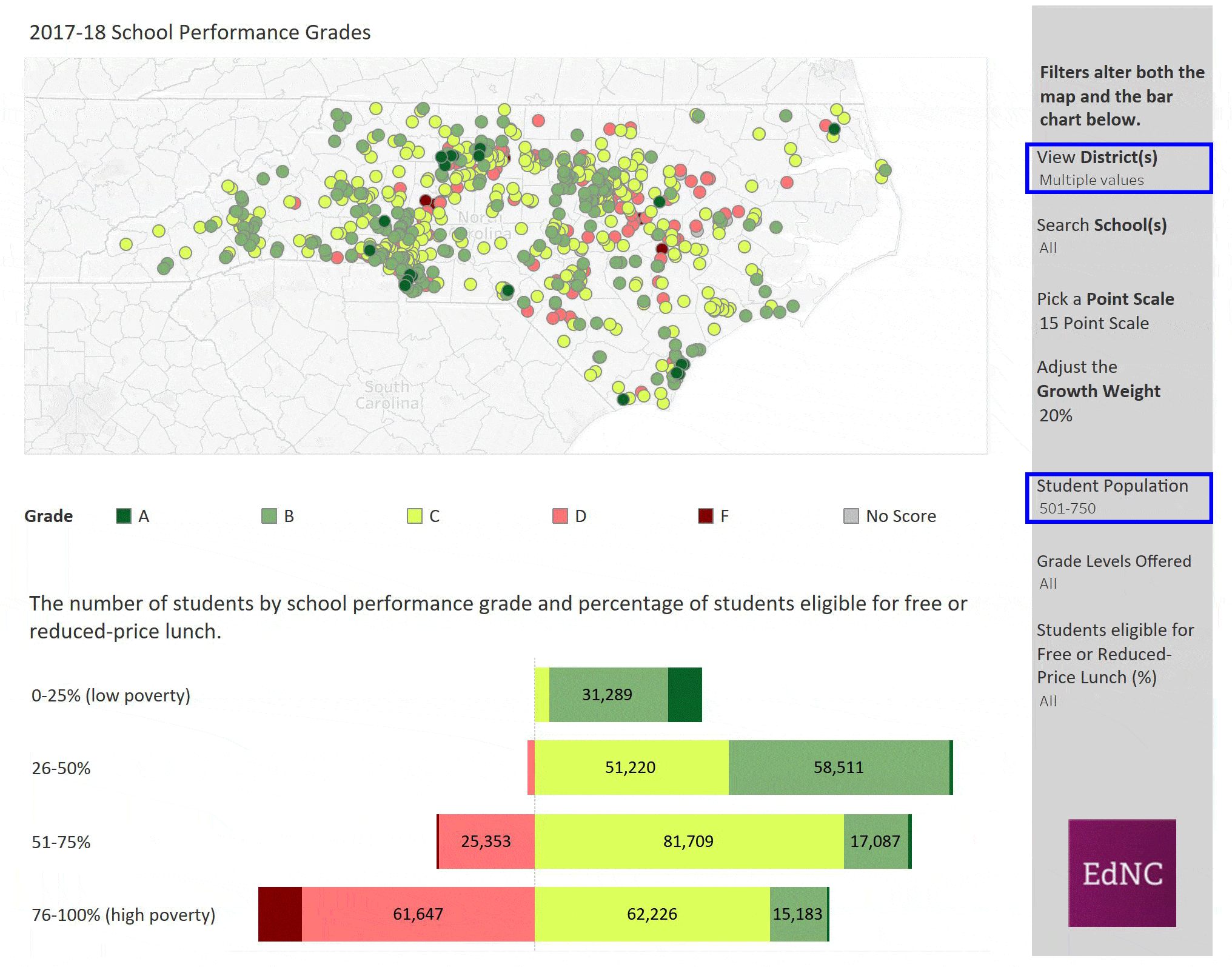 This fall, we’re back to school and back to mapping school grades after a two-year hiatus. Former features on Consider It Mapped covered grades from the 2013-14, 2014-15, and 2015-16 school years and the controversy over the equations used to derive the grades. This year, we’re expanding the functionality of the map and accompanying data visualization with a number of filters so users can play out different scenarios, pulling information for like districts and schools.