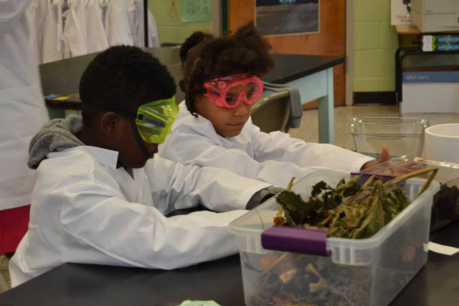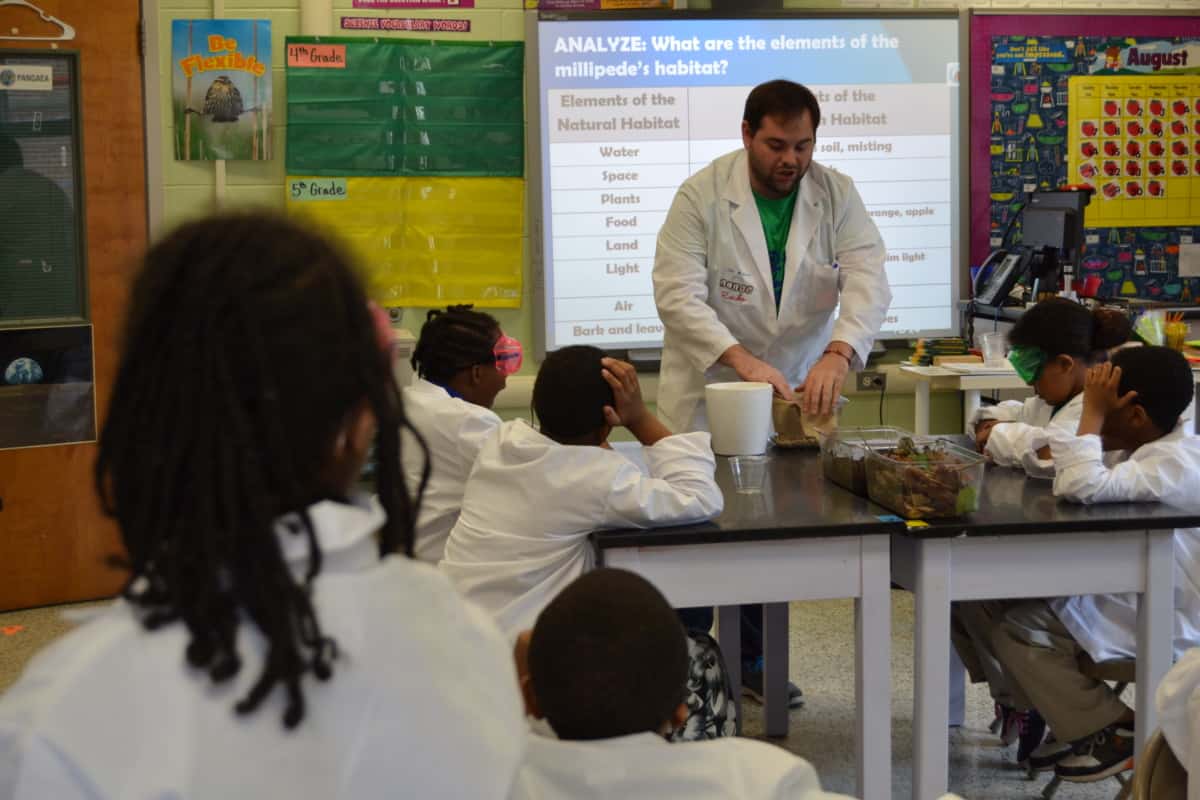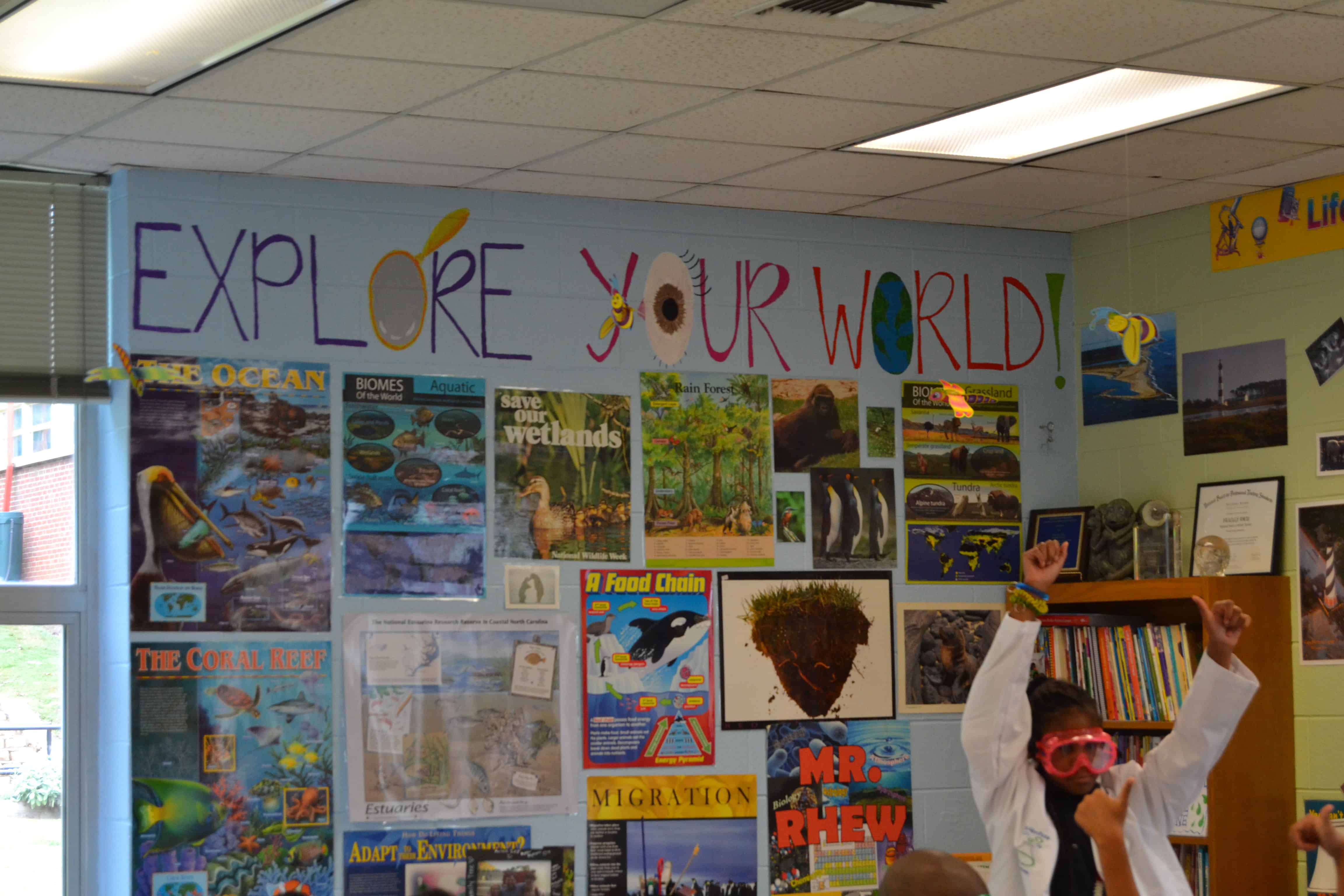 In math, the teacher used a smart board to go through multiplication tables and children assembled little chips into groups to help learn the concept in a hands-on way. In English, there were chairs that allowed students to move as they learned. In breakout reading groups, some students grabbed bean bags and others laid on the floor. And in science, the students wore white lab coats and goggles as they learned about habitats and performed a science experiment. The class bearded dragon, Skeeter, looked on.