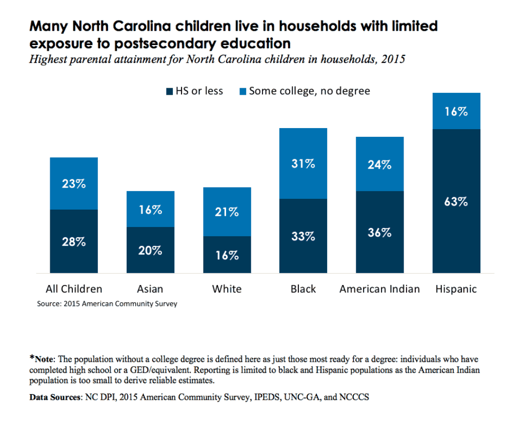 Programs that reach, engage, and successfully enroll, retain, and graduate our state’s growing population of first-generation and minority students will be vital to ensure North Carolina’s progress towards any statewide attainment goal. Failure to improve these outcomes is not only detrimental to the future economic well-being of these children and their families: it will ensure that our state’s primary path to future attainment growth will be the continued reliance on in-migration of highly educated individuals from other states and countries.