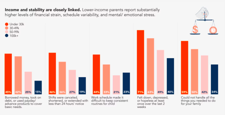 This first survey of Quarterly Insights paints a troubling picture of families feeling economic strain and suffering from depression, burnout, and hopelessness. These conditions reinforce one another, making it harder for parents to show up for their children, their partners, and themselves, maintain routines, and flourish. Ultimately, all of these factors make stability feel perpetually out of reach. While the heaviest burdens often land on those earning the least, working-class and middle-class families also feel the enormous weight of these compounding pressures.
