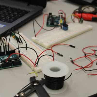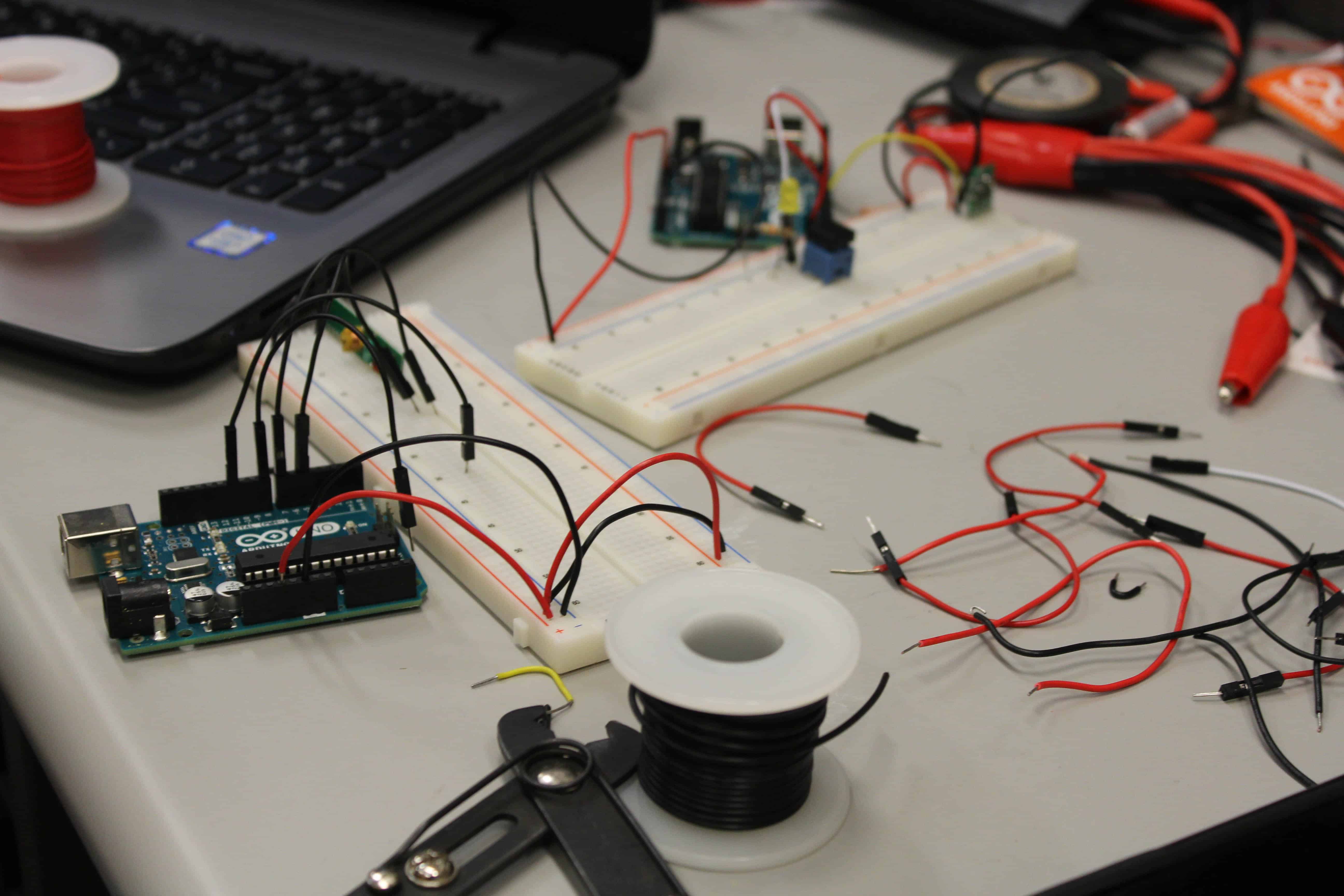 Seven students sat along a row of computers with their in-progress creations scattered across the desk tops: circuit boards, claws, random parts, batteries, and sketches.