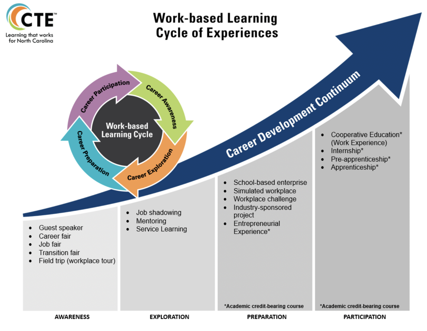 Career development is integral to the state’s CTE strategy. Students are made aware of career options, can explore various careers, prepare for them, and participate in real-life work experiences. The Work-based Learning Cycle of Experiences is integrated into the state’s career development continuum.