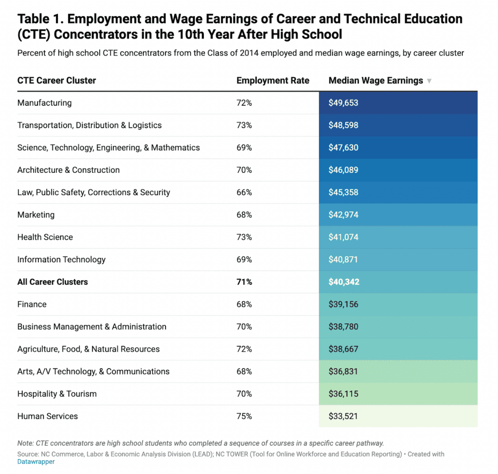 One benefit of CTE is its ability to equip students with technical skills while introducing them to in-demand career fields. A February 2026 report from the North Carolina Department of Commerce explored how the state’s CTE concentrators are doing in the workforce 10 years after high school graduation. The report also looks at how these outcomes differ by career cluster.