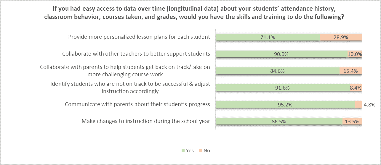 The question in Figure 4 is hypothetical: If teachers had easy access to data over time — also called longitudinal data — about students’ attendance history, classroom behavior, courses taken, and grades, would they have the skills and training necessary to use that data in a variety of ways?