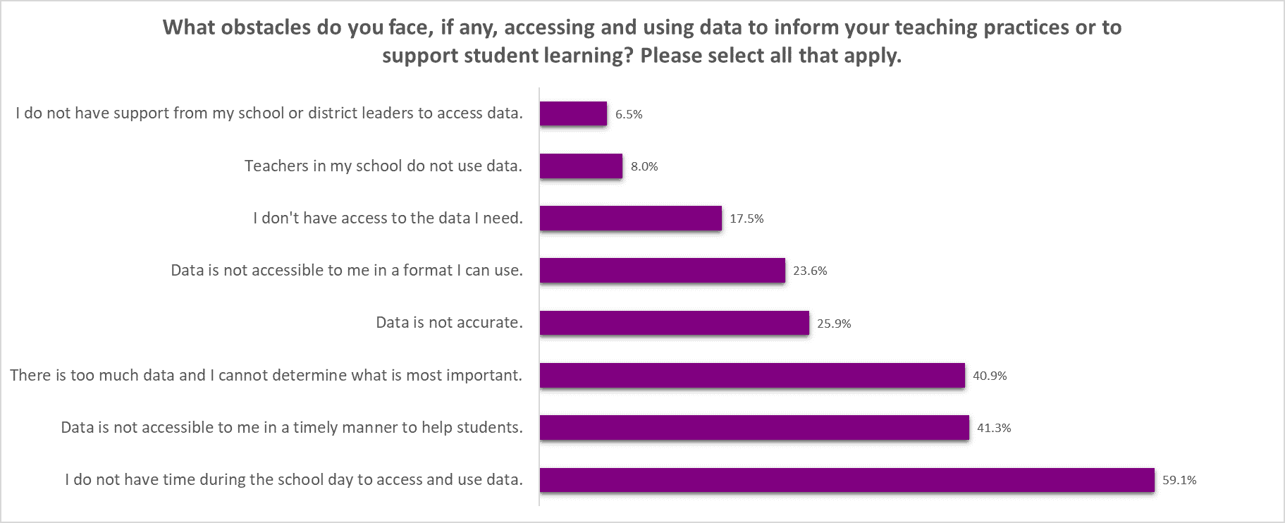 In Figure 7, teachers were asked to select all the obstacles they face, if any, in accessing and using data to inform teaching practices and support student learning. The most commonly selected answer was not having time during the school day to access and use data (59.1%), followed by data not being accessible in a timely manner (41.3%), and not being able to determine what is most important among available data (40.9%).