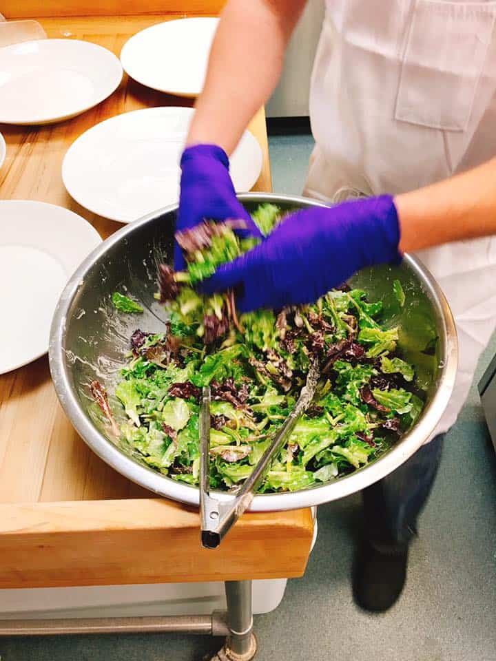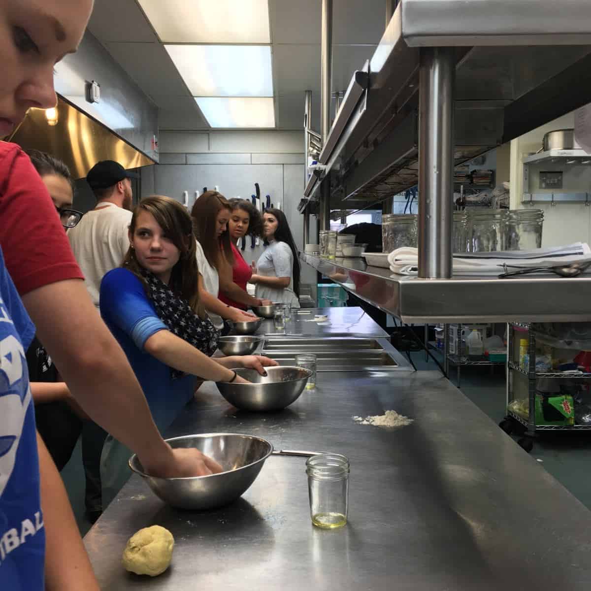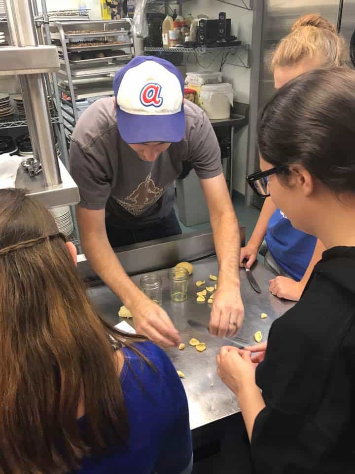 The students split into two groups upon entering the restaurant. Each of the groups alternated between a discussion with Aaron at the communal table in the dining room and a tour of the kitchen which also led to them assisting Aaron’s staff with meal prep.