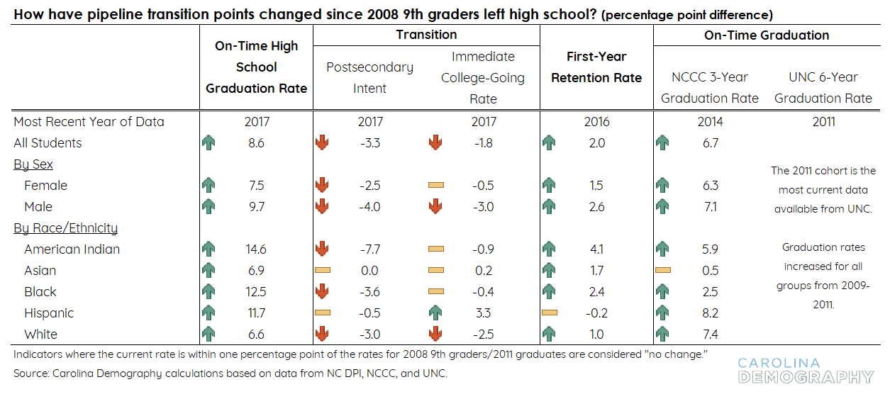 While on-time high school graduation rates have improved, recent graduates are less likely than those who graduated in 2011 to report postsecondary intentions and are less likely to immediately transition to college. However, once enrolled at NCCC or UNC, first-year students are more likely to return to that system for a second year compared with 2011 high school graduates. Those students attending community colleges have an increased probability of completing a degree or credential within three years.