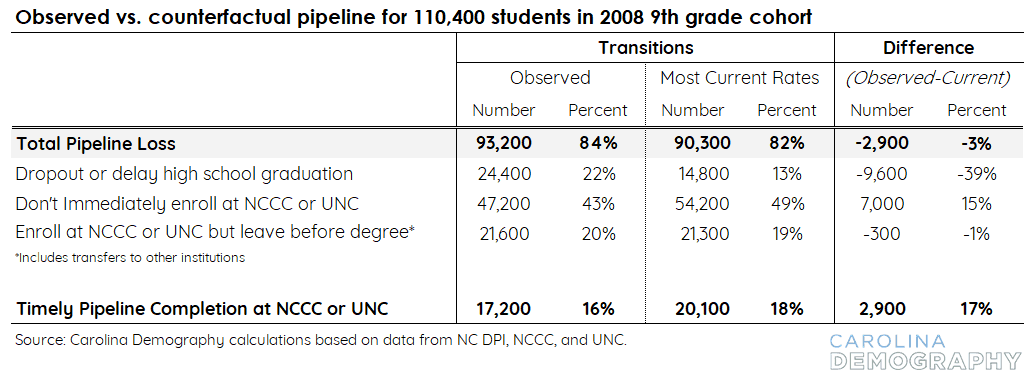 Nineteen percent, or 21,300, would enroll on time at NCCC or UNC but leave prior to timely degree completion (three or six years, respectively). This is a decrease of 300 ninth graders, or 1%, from the observed number of 21,600. Although the likelihood of transitioning to postsecondary education decreased, the share of students successfully completing their degrees once enrolled did increase.