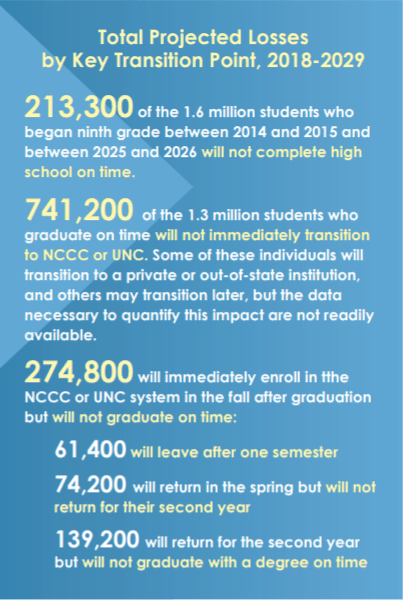 - 274,800 graduates will immediately enroll at NCCC or UNC but will not graduate on time: