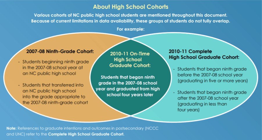 The most recent complete pipeline data are for the cohort of NC public school students who entered ninth grade in the 2007-08 school year. They may be referred to as the “2008 ninth graders” or the “2008 ninth-grade cohort” in the remainder of this section.