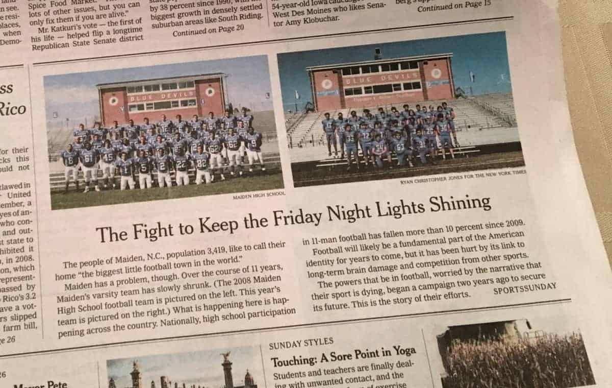 The teenagers of Maiden, a town of 3,419 people on highway 321 between Hickory and Gastonia, served to illustrate the notable decline in boys playing high school football across the nation and in North Carolina. The Times launched an examination of “football’s hold on America,’’ promising more stories in the coming weeks.
