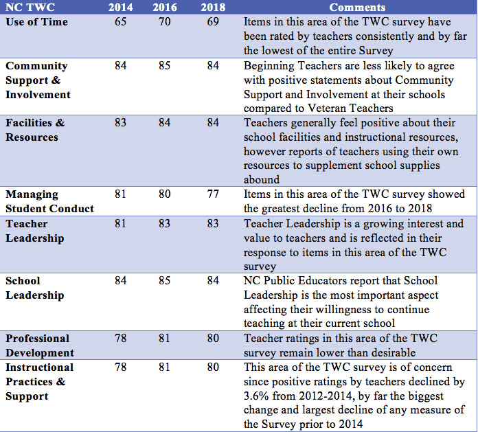 The number of NC TWC Survey items have been altered and increased over the years as the research base around teacher quality has improved. The eight scales of the survey are: