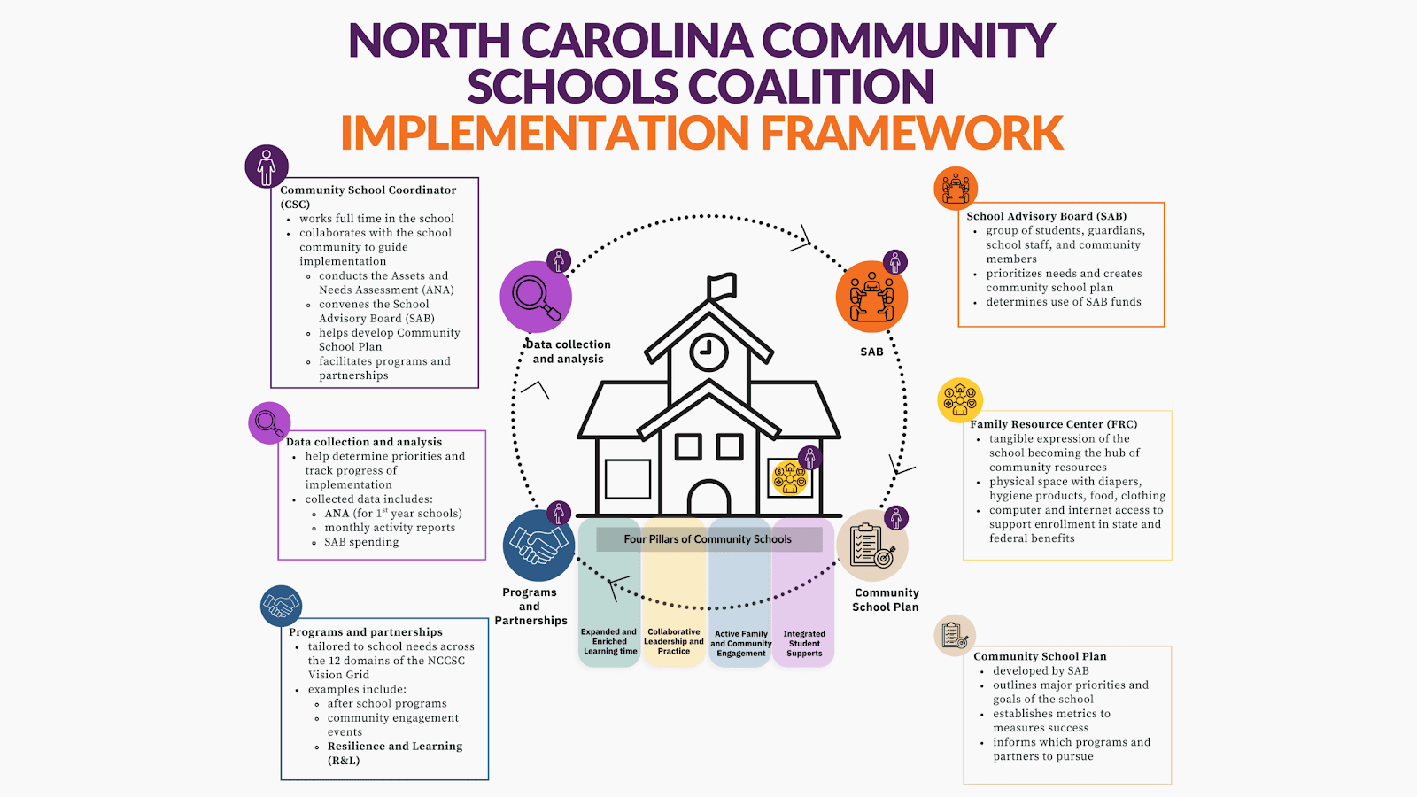 Taking a step back from the end product and focusing instead on the process and the goal of doing work that is appropriately hyperlocal (i.e., initiatives that accurately reflect the unique strengths and challenges of a particular community), we see that the apparent contradiction is, in fact, a healthy tension. The North Carolina Community Schools Coalition (NCCSC) implementation framework provides an example of how this tension between hyperlocal initiatives and standardized approaches is resolved.
