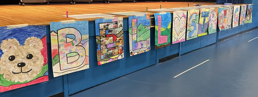 Erin Seickel is the art educator at both Bell and at Barnardsville Elementary. She worked with each school separately to do a collaborative painting. At Bell, each class designed a portion of the “Bell Strong” banner, and it was brought out all together at the first Bell Bear assembly after the storm.