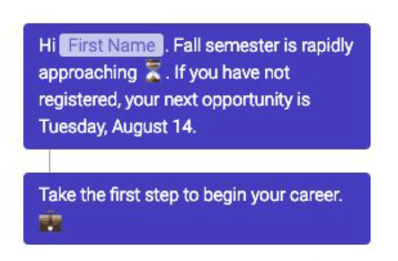 The program’s grant included funding to support 50,000 chatbot messages per month. The grant also covered staff support from AdmitHub for the technical implementation, weekly phone conferences, suggested language for campaigns, initial knowledge base for the bot, annual business reviews and a schedule of suggested student engagement points. [xxiv]