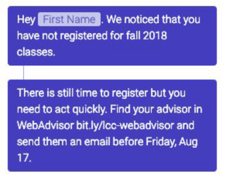 LCC representatives acknowledged that summer melt was an issue that they had not previously tracked. This was partly due to the challenges of the open-enrollment structure. Prior to the chatbot pilot program, LCC’s main tactic for reducing summer melt had previously focused on sending out hard-copy letters to students about the enrollment process. These letters did help provide students with increased access to enrollment processes information and deadline reminders. Yet administrators felt that utilizing a digital connection platform via AdmitHub could help both deepen and expand their reach to students.