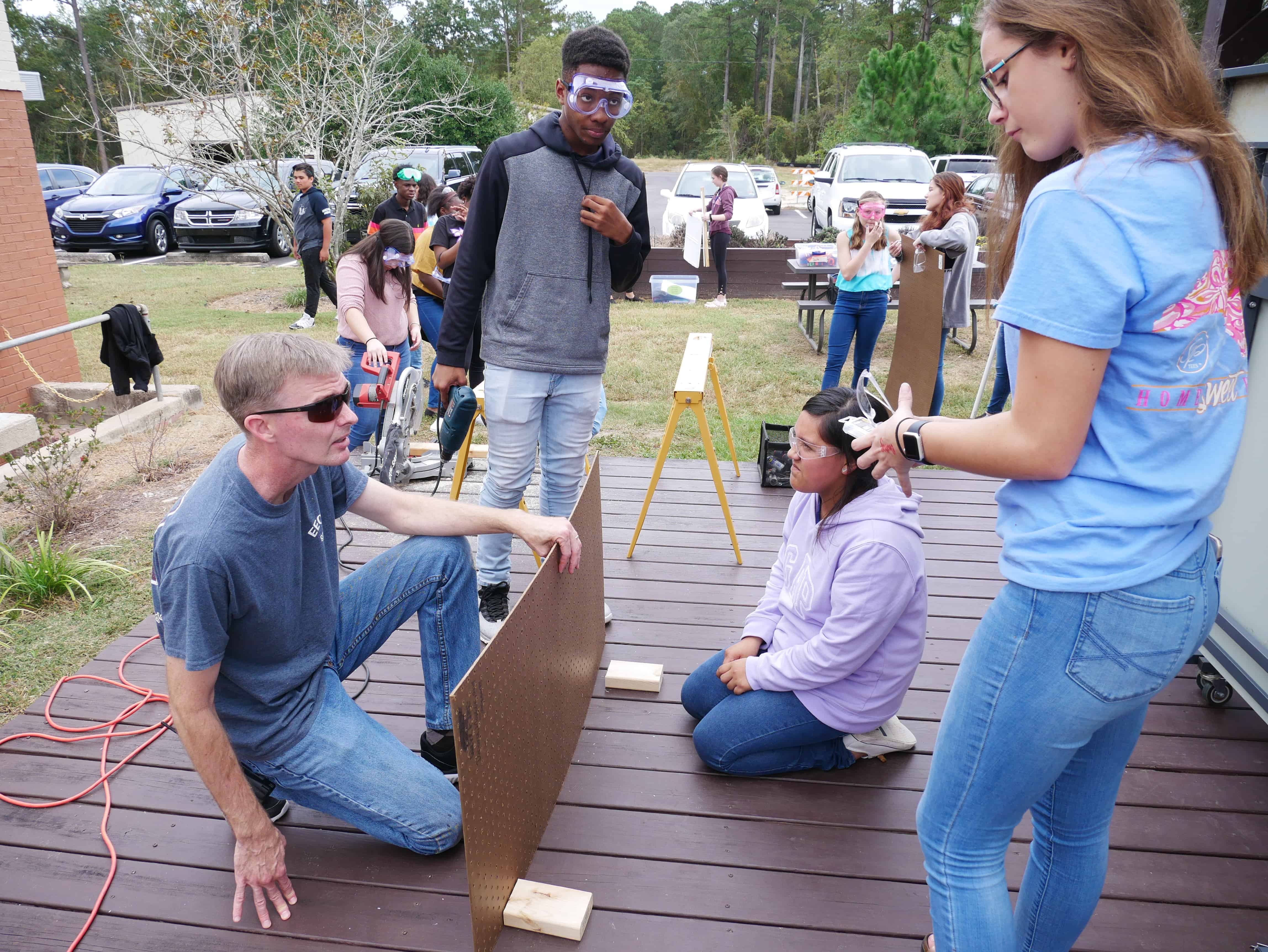While juniors and seniors take more courses on the college campus and less in the high school experience, two major projects keep them connected to their high school. During junior year, students create a project centered on an internship with some outside organization or experience. The staff helps facilitate those connections, and — as Bristow-Smith was doing during construction class — guides students to ensure a meaningful real-world learning experience. Bristow-Smith said creating opportunities for students to interact with institutions and professionals is valuable for students’ learning, self-discovery, networks, and career planning.