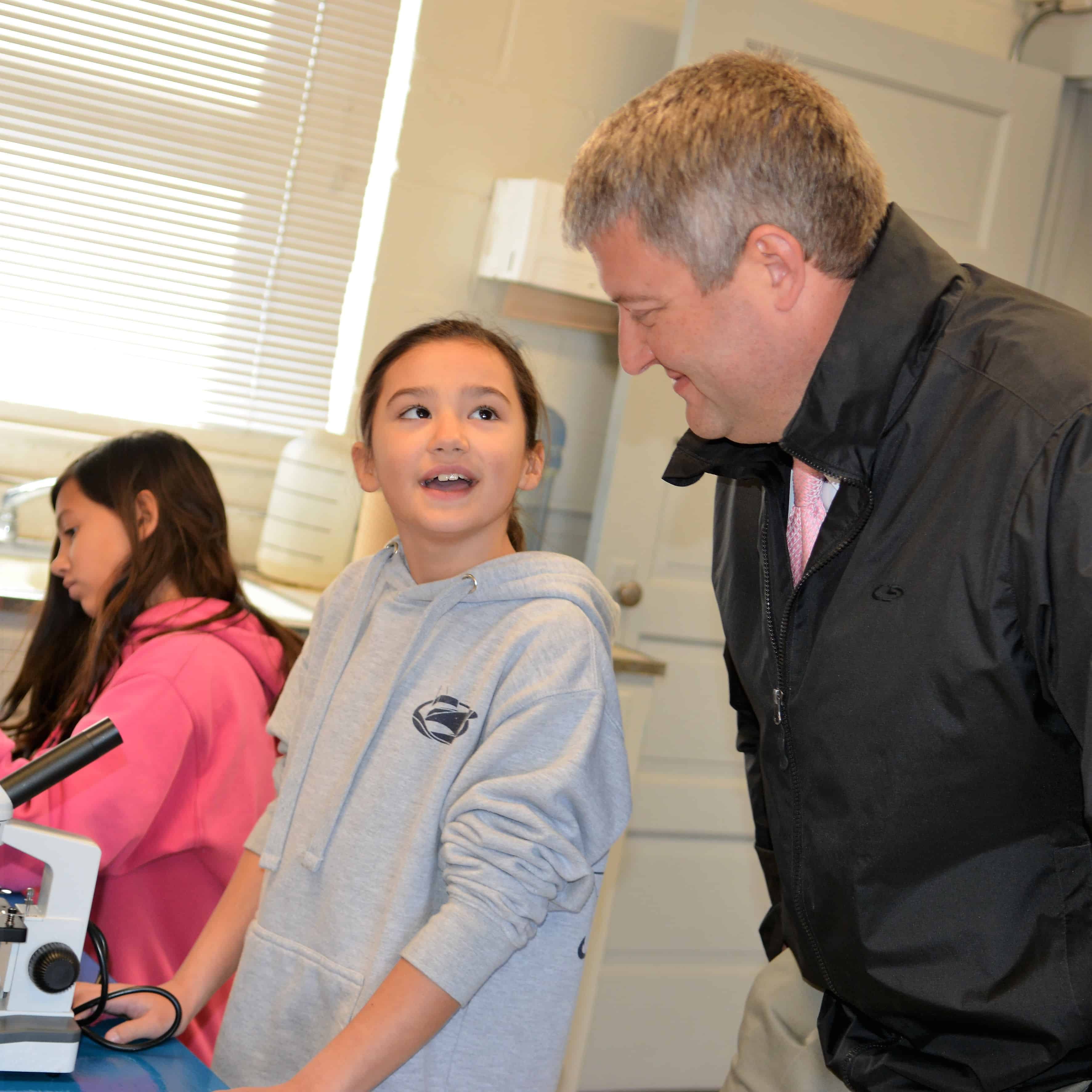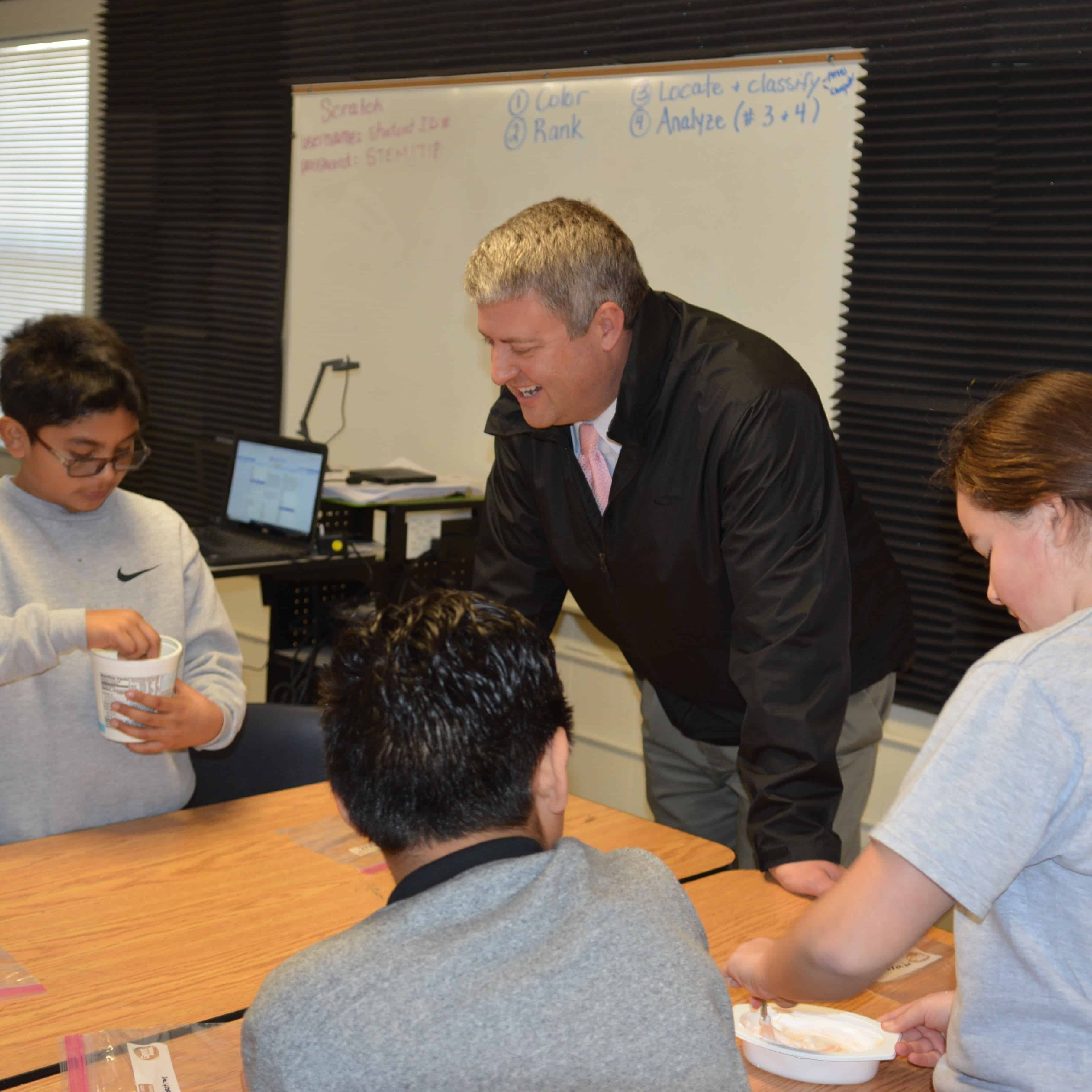 You can tell a lot about a principal by watching him in a classroom. You can tell if it is unusual for him to be there by the way the students and teachers react. You can tell whether they are hands-on or hands-off by whether and how they interact. Olander was the first one to respond when a student accidentally broke a glass slide for the microscope, kneeling down to make sure he picked up all the shards.