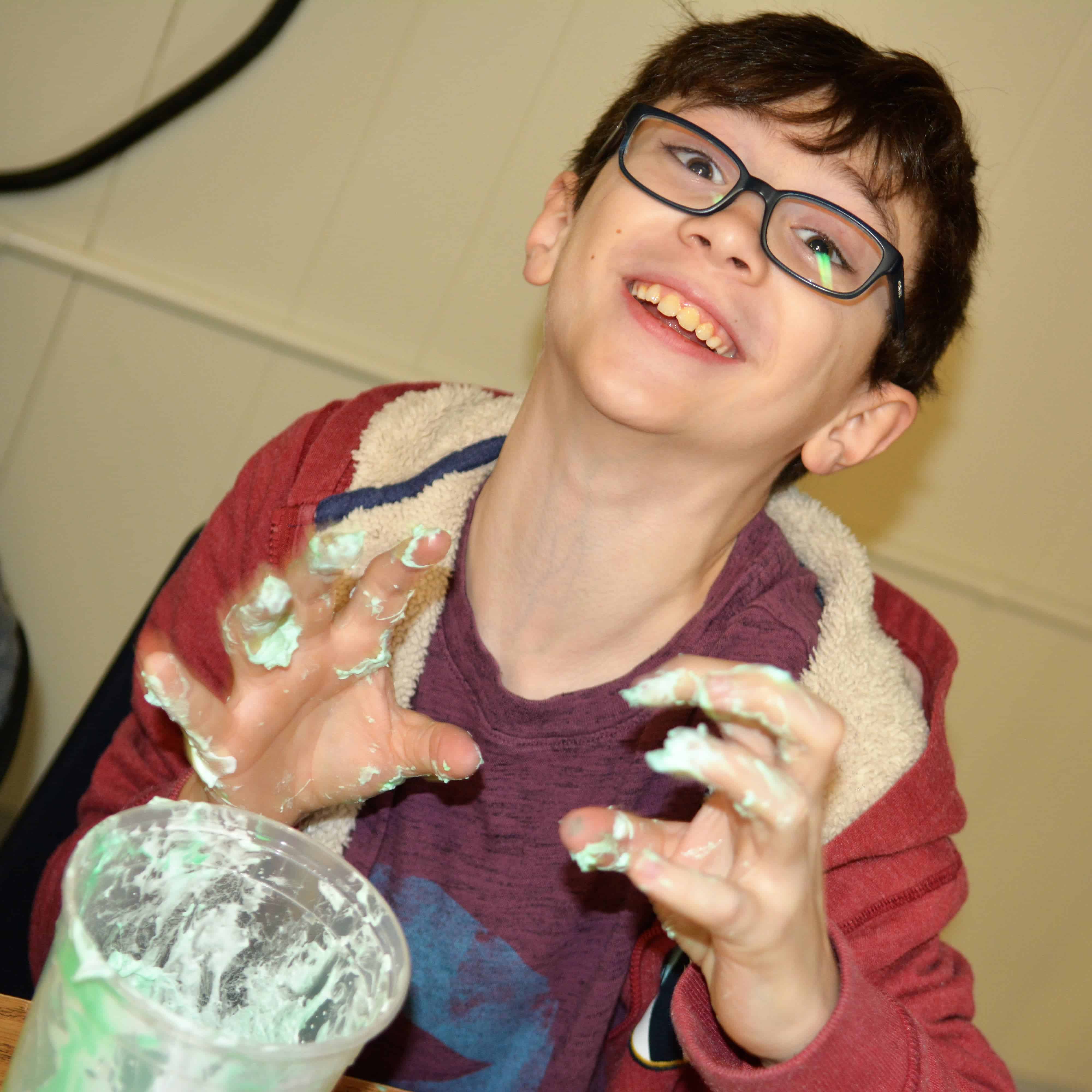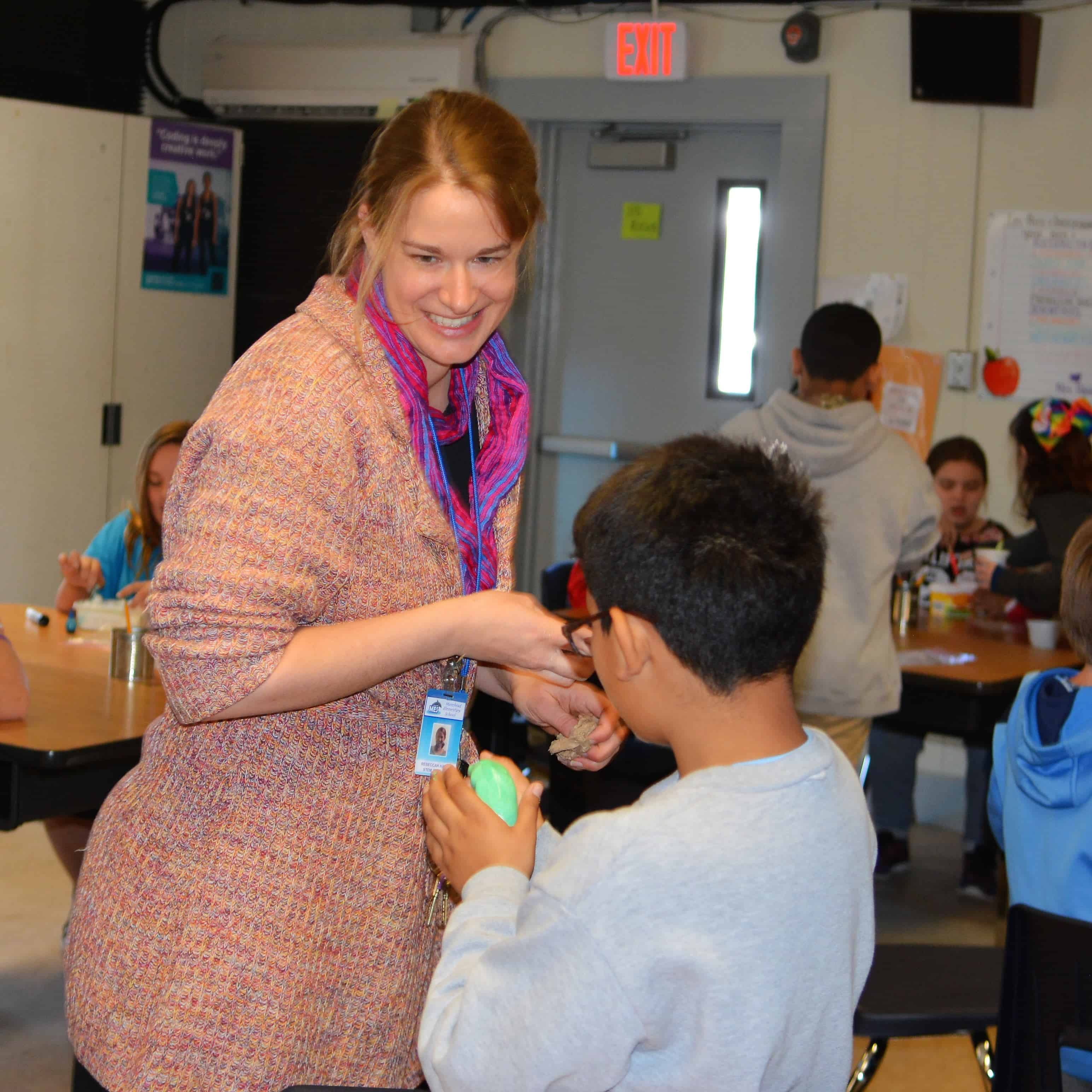 In this STEM classroom, Rebeccah Haines teaches students chemistry and team work by making slime with shaving cream, glue, colored dye, and liquid starch, which serves as an activator. Housed in what they call the “WOW” building, this instructional space used to be an old outbuilding.