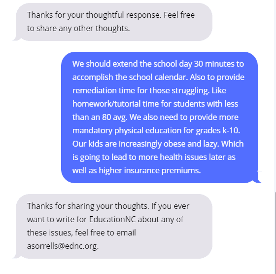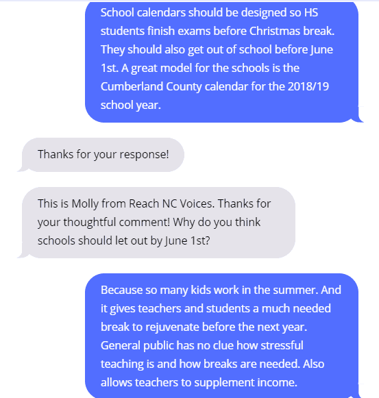 Dialogue is the core of our work to place the public back in public policy. We recently launched a new project, the Reach Roundup office hours. These office hours involve us sending out the Question of the Week via text to thousands of North Carolinians, and then instead of just pressing send, we are there to respond in real time, to ask follow-up questions, and to ask those who respond to share their opinions by writing a perspective for EdNC.org and the state. Office hours also make it possible for anyone to text in a pressing question, story, or comment. We are there to answer those questions, respond to those stories, and play a role in connecting people.