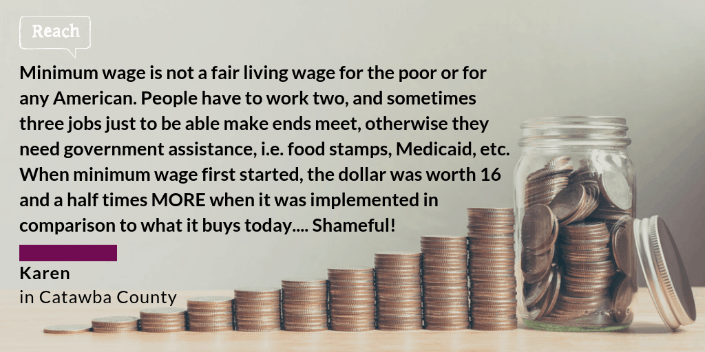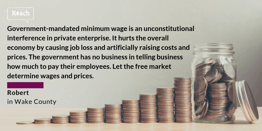 This week, we heard opinions on the minimum wage from hundreds of Reach NC Voices members. Proponents of raising the minimum wage cited concerns about the inability of an individual to meet their basic needs on a $7.25 per hour income, which equates to about $15,080 a year before taxes (considering 52 40-hour work weeks). Critics of minimum wage increases cited factors that may reduce employment as firms raise prices to offset their increased costs of employees, including automation and reduced sales.