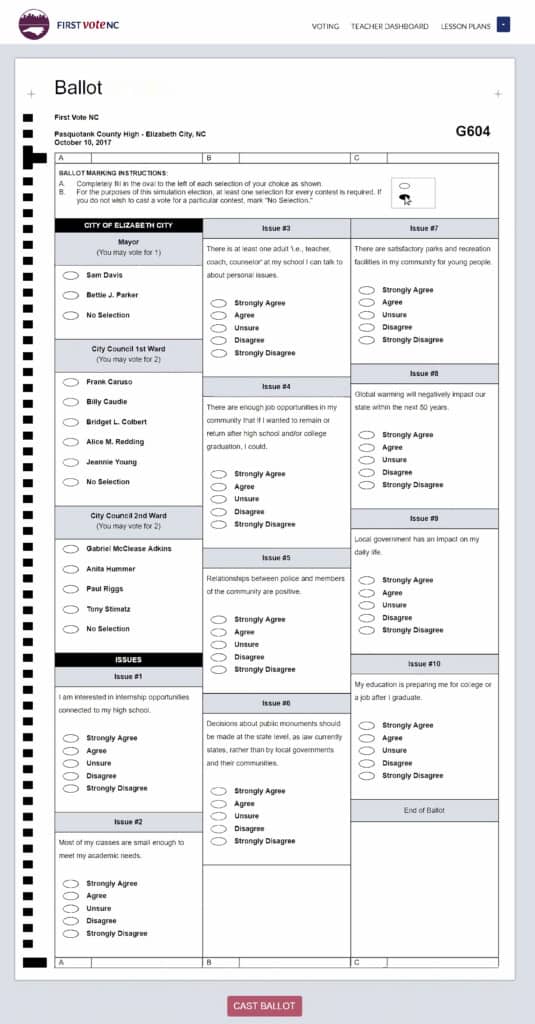 While November 7th is the date most North Carolina counties will hold 2017 local general elections, a few were held on October 10th. Pasquotank High School in Elizabeth City was one of five schools across North Carolina that participated in First Vote NC’s October local election simulation. First Vote aims to motivate students to become civically engaged and demystify the voting process.