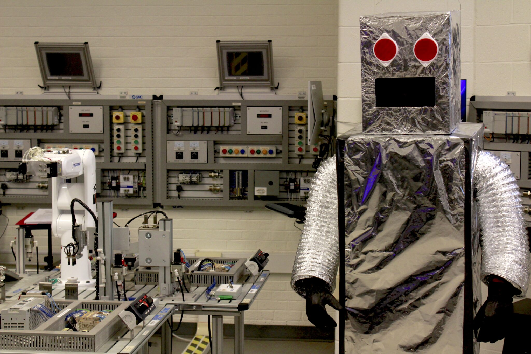 A robot with a robot at Richmond Community College’s Trick or Treat to the trail community event. Derick Lee/EdNC