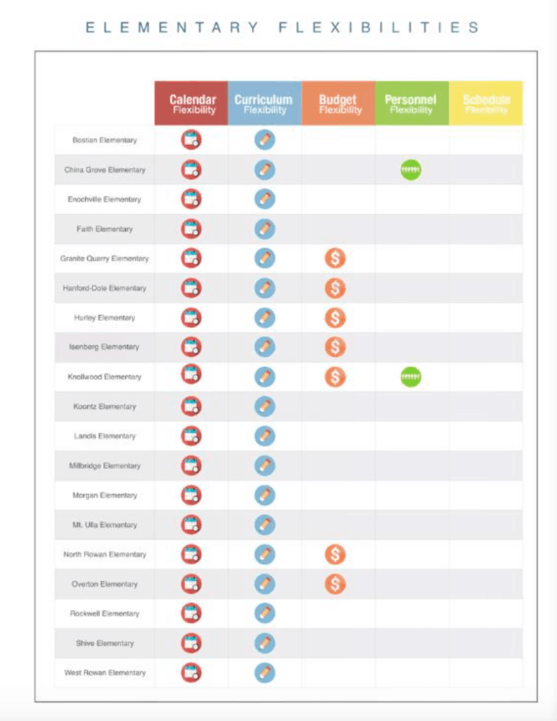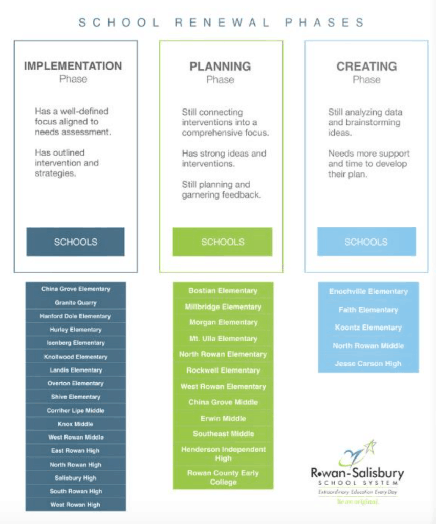 The renewal school system is a novel approach to education in North Carolina. The General Assembly granted the Rowan-Salisbury School District (RSS) this designation last year, and the 2018-19 year was the district’s first under the new program. Renewal gives all the schools in the district charter-like flexibility. Schools can be exempt from state mandates related to how money is spent, which teachers can be hired, what curriculum can be used, when schools can start and stop, and more.