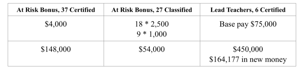 Under the plan, six Lead Teachers would receive salaries of $75,000 and all staff — certified and classified, full time and part time —would receive annual bonuses for serving at an at-risk school. Lead Teachers and administrators would not qualify for the bonus.