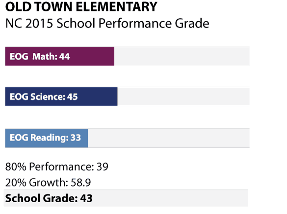 According to Principal Benjamin “Rusty” Hall, “We have great kids. Very low discipline issues, they are eager to learn and are a good group.” Last October, the Winston-Salem Forsyth County School district named Hall the Principal of the Year. And yet — according to the official North Carolina public school assessments — Old Town Elementary received a D (43) on its 2014 and 2015 report cards. Every public school in North Carolina is issued one of these performance grades, which reflect 80 percent achievement and 20 percent growth in student reading, science, and math test scores.