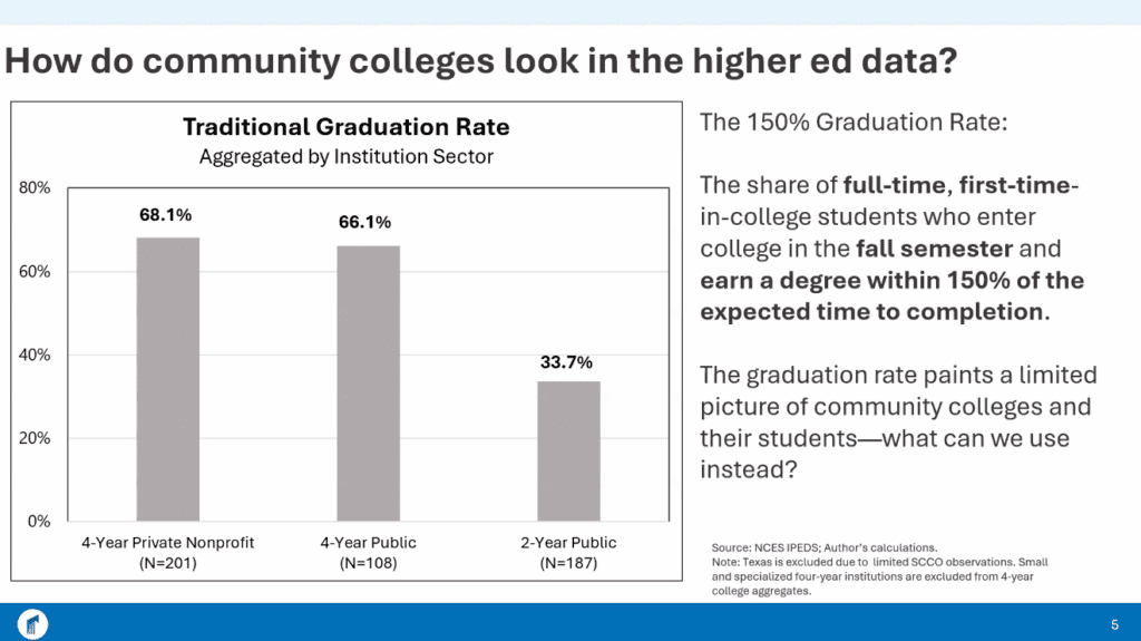 The success of community colleges is often misrepresented in postsecondary education data, Norris said. As the figure below suggests, traditional graduation rates do not fully capture the range of successful outcomes that community college students experience.