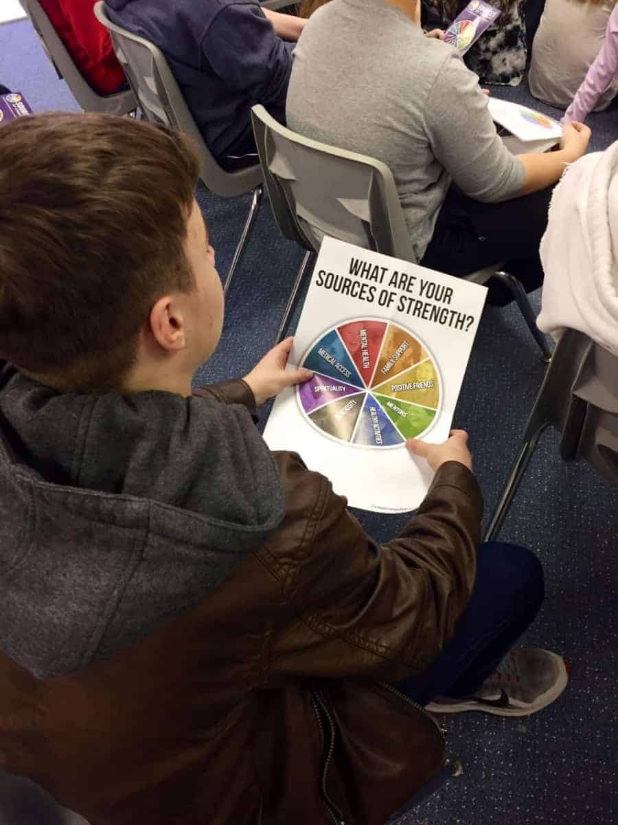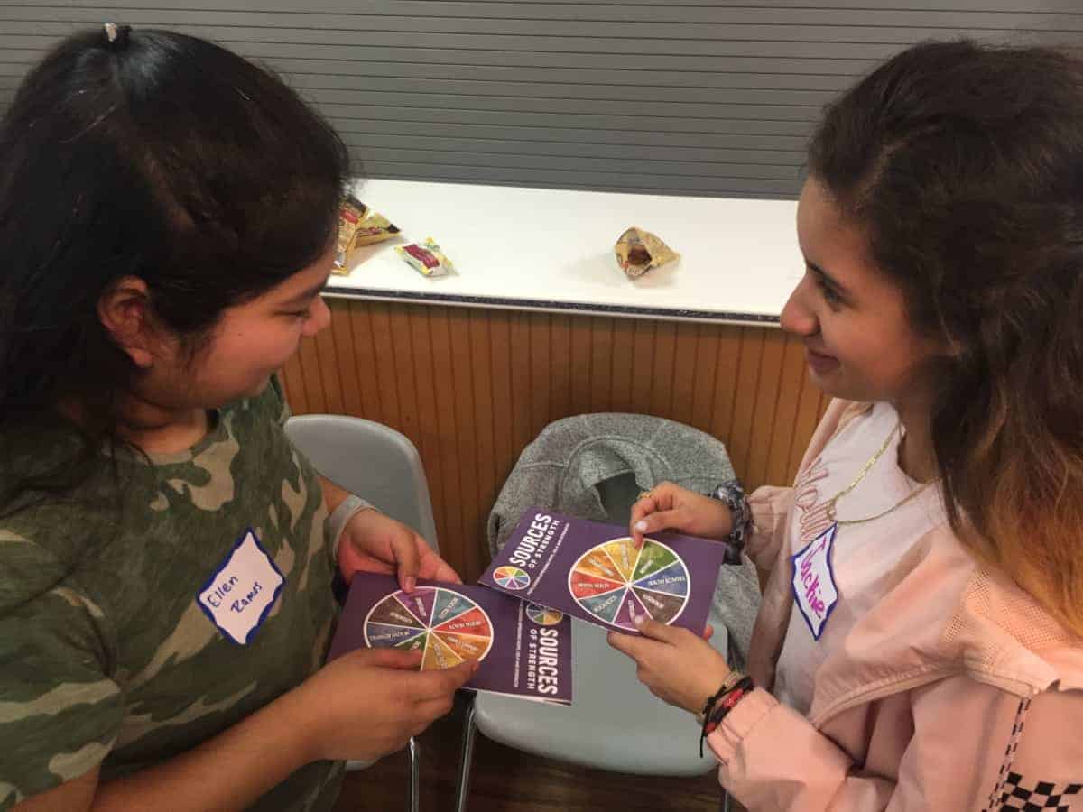 Throughout the training, students were asked to identify things in their lives that give them strength. This set up a main piece of the program, the Sources of Strength wheel. The wheel is divided into eight pieces labeled family support, positive friends, mentors, healthy activities, generosity, spirituality, medical access, and mental health. Each can be a source of strength for someone, and when called upon, it can be a reminder that you are not alone.