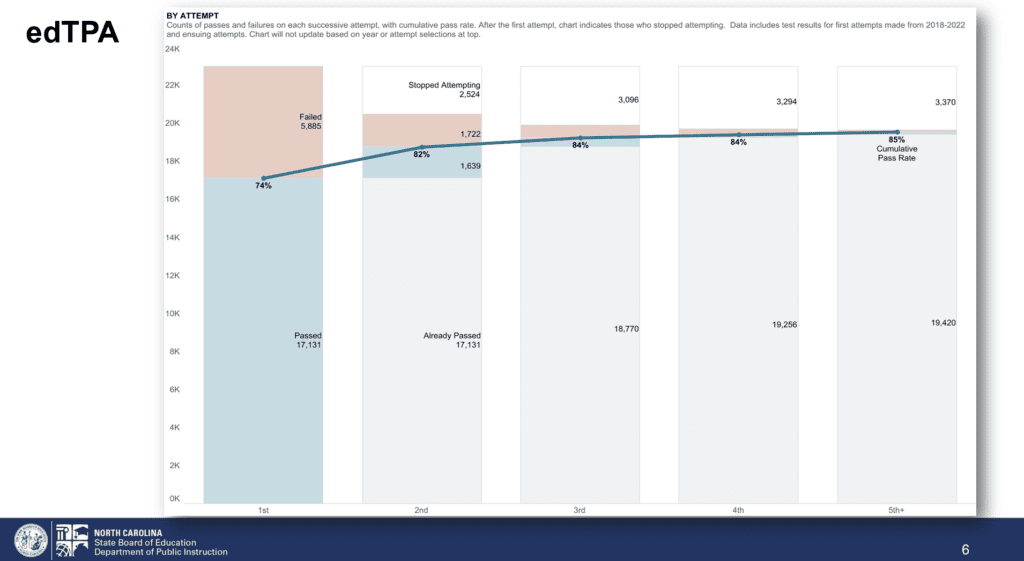Thomas Tomberlin, senior director of DPI’s Office of Educator Preparation and Licensure, said that of test-takers who don’t pass on the first attempt, 57% don’t take the test again.