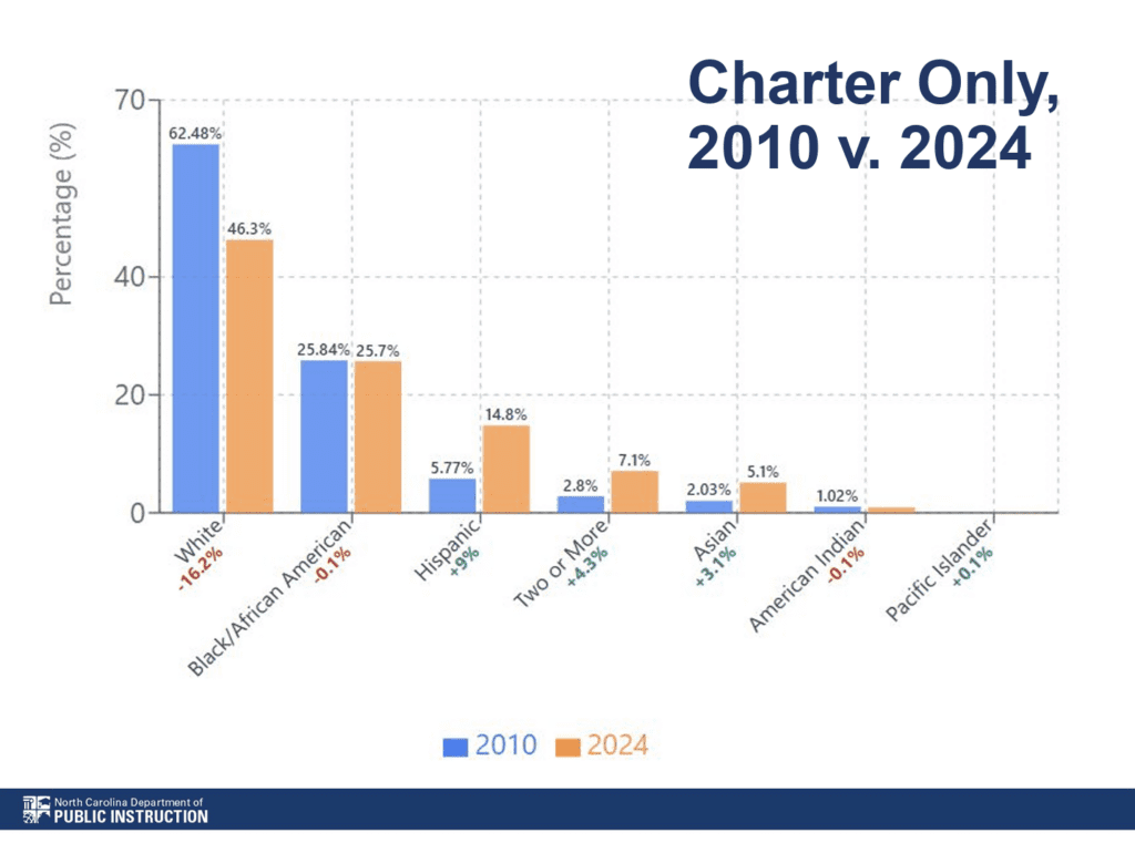 Charter school demographics are changing, which Baquero said indicates a shift to a more “diverse student body.” Despite a drop in enrollment, white students continue to be overrepresented in charter school enrollment, and Black student enrollment has remained steady. While Hispanic student enrollment has grown, Baquero said Hispanic students are still underrepresented in North Carolina charter schools.