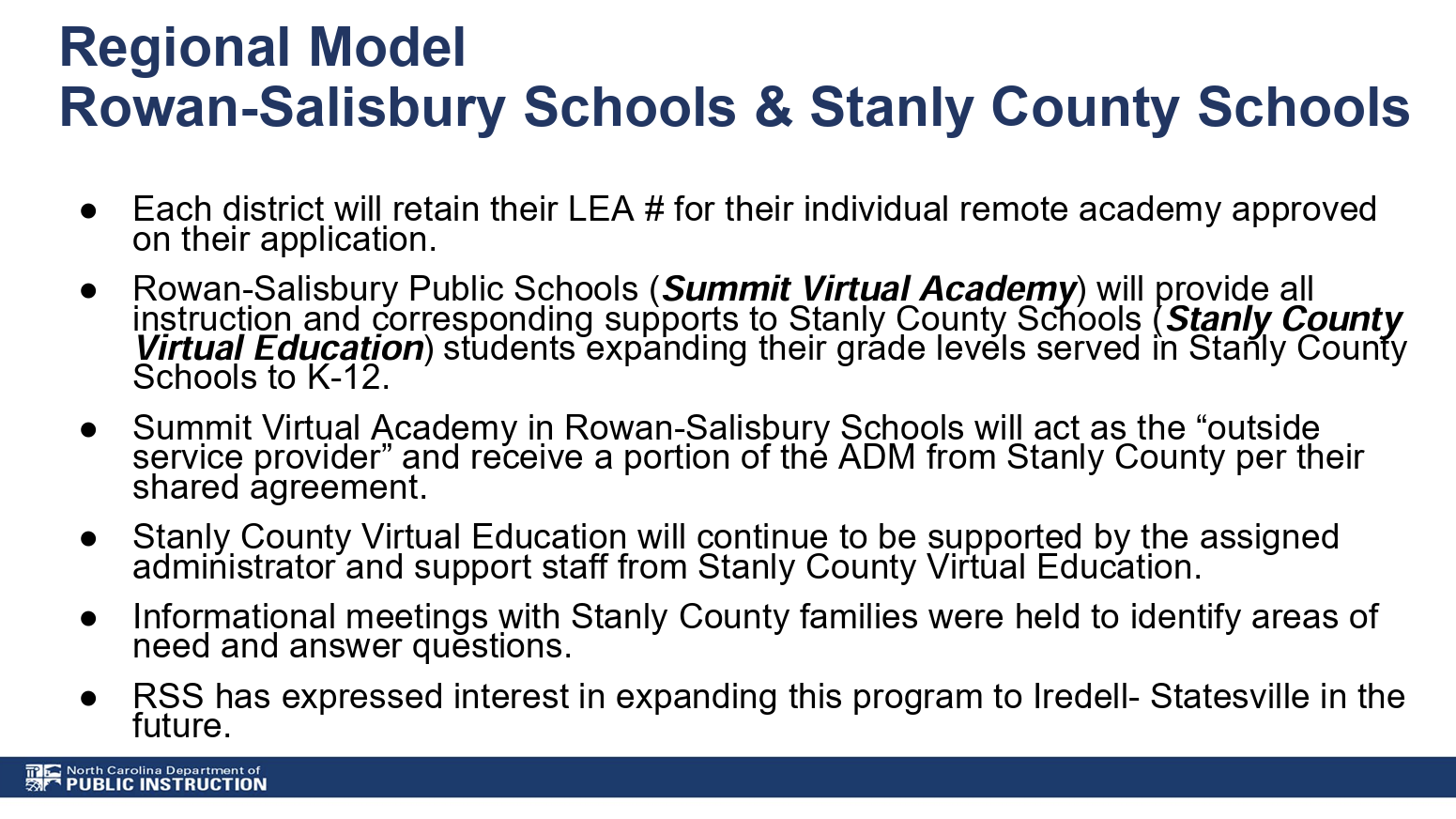 The Board highlighted a recent regional collaboration between Rowan-Salisbury Schools and Stanly County Schools, which allows the districts to share instructional services while maintaining local oversight. The partnership has allowed Stanly County Schools to expand its remote offerings to serve K-12 students.